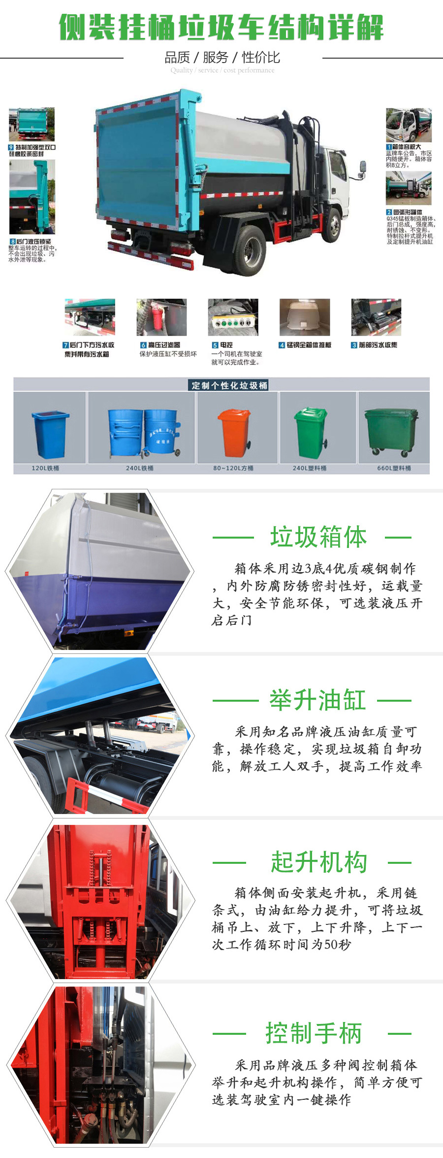 自动举升垃圾桶倒入垃圾,提升机顶部带机械翻盖,箱体底部双液压举升自卸,液压系统控制提升机上升+下降+自卸作业,箱体后部设有挡水槽,尾部装有橡胶密封条,防污水滴漏。适用于城乡街道垃圾桶、生活区垃圾桶、工业园区垃圾桶的垃圾收集转运。