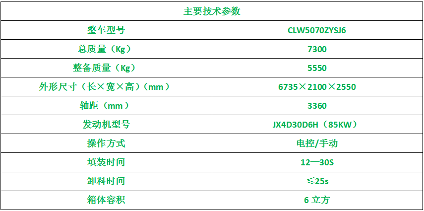 上装配置:箱体厚度采用边4个厚、底4个厚的优质碳钢板生产,全箱体满焊,箱体为联体式,外接电源工作,翻转进料,带压缩推板,后部带锁紧门,带污水收集箱,带室内操作系统,也可以室外双操作,做到驾驶室内和尾部外都可以操作,非常实用,尾部带密封橡胶垫,可防污水滴漏二次污染。