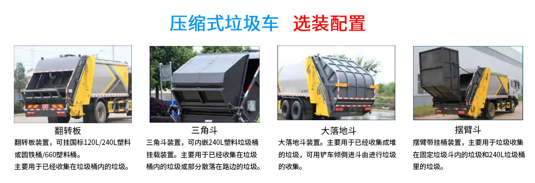 选装配置:可选挂桶架、三角斗、全密落地斗、摆臂装置。