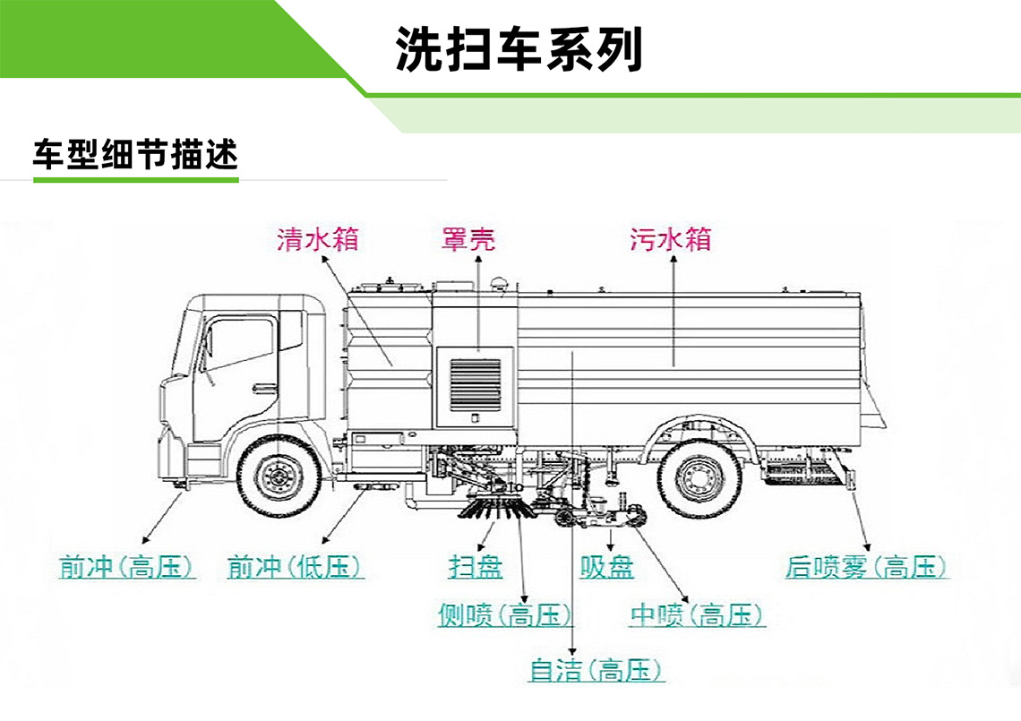 洗扫车集扫路车、洒水车和高压清洗车功能于一体,具备路面清扫、路面洗刷、高压清洗、低压冲洗、路缘石洗刷、垃圾收集、污水回收、喷雾降尘和道路隔离墙清洗、小广告清洗等多种作业功能。