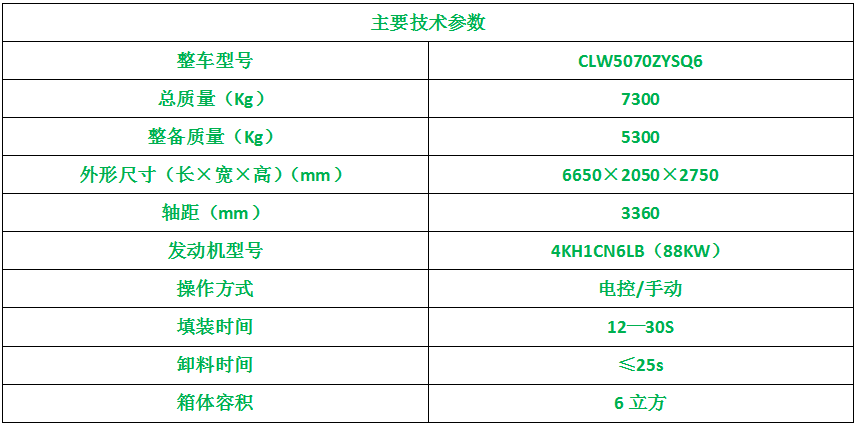 上装配置:箱体厚度采用边4个厚、底4个厚的优质碳钢板生产,全箱体满焊,箱体为联体式,外接电源工作,翻转进料,带压缩推板,后部带锁紧门,带污水收集箱,带室内操作系统,也可以室外双操作,做到驾驶室内和尾部外都可以操作,非常实用,尾部带密封橡胶垫,可防污水滴漏二次污染;